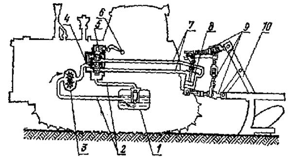 Рис.8.1. Розміщення складальних одиниць гідро начіпної системи на тракторі: 1 – масляний бак; 2 – маслопроводи низького тиску; 3 – шестеренний насос; 4 – розподільник; 5 – золотник; 6 – важіль керування розподільником; 7 – маслопроводи високого тиску; 8 – силовий циліндр; 9 – начіпний механізм; 10 – плуг