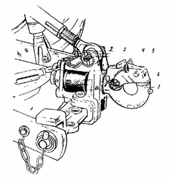 Рис.8.3. Тягово-зчіпний пристрій. 1 – центральна тяга; 2 – корпус; 3 – упор; 4 – стопор; 5 – собачка; 6 – защіпка; 7 – гак.