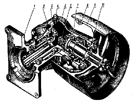 Рис.8.4. Приводний шків: 1 – рукав шківа; 2 – регулювальні прокладки; 3 – вал приводу шківа з ведучою конічною шестернею; 4 – пробка масло заливного отвору; 5 – корпус шківа; 6 – пробка контрольного отвору рівня масла; 7 – вал шківа з веденою конічною шестернею; 8 - вантаж для балансировки шківа; 9 – шків; 10 – регулювальні прокладки