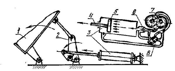 Рис.8.6. Схема підйомного механізму автомобіля-самоскида: 1 – рама кузова; 2 – важільний механізм; 3 – силовий циліндр; 4 – шток; 5 – поршень; 6 – клапан; 7 – насос; 8 – кран управління