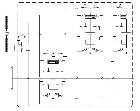 Рис. В.3 – Кінематична схема тривалової п'ятиступінчастої коробки передач з подільником (автомобіль КамАЗ–5320)