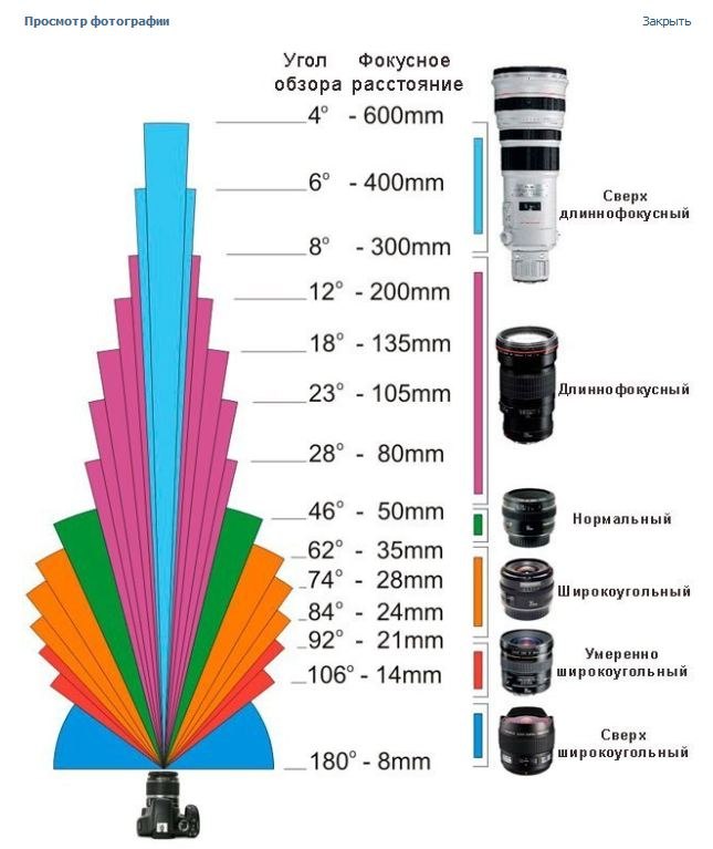 Как определить фокусное расстояние моего объектива? Если вы внимательно читали эту главу, то понимаете, что фокусное расстояние – вполне себе осязаемая величина, и что вычислить её приблизительное значение можно при помощи обычной линейки. Соответственно, длинные объективы фотожурналистов, похожие на подзорные трубы – это телеобъективы, а плоские, «тонкие» модели, которые можно увидеть в фотомагазинах – их широкоугольные собратья. К счастью, производители снабжают свои объективы подробным описанием характеристик, а поскольку фокусное расстояние является едва ли не основным параметром объектива, то его величину пишут прямо на оправе. Возьмите в руки свой фотоаппарат, и поищите на объективе числа, заканчивающиеся сокращением «mm». Это и есть фокусное расстояние объектива. Именно столько миллиметров от матрицы до основной линзы в вашем устройстве. Почему на моём объективе указаны два фокусных расстояния через дефис? Всё очень просто! Большинство стандартных фотоаппаратов укомплектованы объективами с переменным фокусным расстоянием. Такие модели называются зум-объективами. Вспомните, когда вы хотите приблизить объект съёмки, укрупнить его на кадре, вы нажимаете кнопку, и как по волшебству изображение в видоискателе увеличивается, приближается! При этом ваш объектив сам становится длиннее, превращаясь из короткофокусного в длиннофокусный. Вот тут мы и подошли к самому главному... Теперь понятно, чем отличается одно фокусное расстояние от другого: если объектив короткофокусный, то через него на матрицу проецируется очень много пространства, а если объектив длиннофокусный, то пространства на матрице помещается гораздо меньше. Поэтому объектив с коротким фокусным расстоянием называется иначе широкоугольным – угол обзора у него очень широкий, он способен захватить в кадр много предметов. В отличие от длиннофокусного объектива, который хоть и не умеет смотреть на мир широко, зато вполне может сфотографировать Луну не в виде маленького кружочка, а по-настоящему красиво. Телеобъектив – это и вправду настоящая подзорная труба! Чтобы уложить информацию в голове, внимательно рассмотрите следующую картинку.