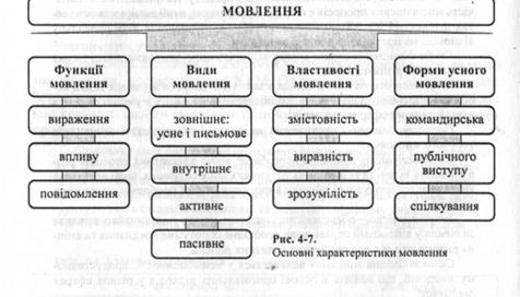 Швидкість мисленнєвих процесів виявляється у невідкладному прийнятті нестандартних рішень, як правило, в екстремальних умовах. Вона може бути як інтуїтивною, так і усвідомленою, тобто пов'язана з повним рефлексивним аналізом усіх етапів мисленнєвого процесу. Наприклад, саме швидкість мисленнєвих процесів є основним моментом, який вимірюється в тестах інтелекту Г.Ю. Айзенка, коли потрібно якнайшвидше дати правильну відповідь на поставлене в задачі запитання. Глибина мислення сприяє аналізові, порівнянню, знаходженню суттєвих зв'язків між різними явищами. Широта мислення виявляється в залученні до розв'язування задачі необхідних засобів, знань і вмінь, безпосередньо не даних в умовах задачі, а взятих з інших сфер знань, наук. Гнучкість мислення протилежна ригідності і є однією з головних умов творчого мислення. Стратегічність мислення передбачає вибір адекватних способів розв'язування задачі та відповідних розумових дій у ситуаціях, коли необхідно визначати концептуальні підходи вирішення певної проблеми, наприклад, бойової. Імпульсивність—обережність мислення мають надзвичайно важливе значення у військовій справі, коли необхідне їх розумне поєднання та вміння ризикувати під час прийняття складних рішень. Самостійність мислення виявляється у нешаблонності, продуктивному мисленні, що лежить в основі оригінальних підходів у різних сферах діяльності. Рефлексивність — це здатність до творчого аналізу ситуації, вияв самосвідомості особистості в аналізі проблемних ситуацій. Існують також і інші властивості мислення. Наприклад, організованість, дисциплінованість, послідовність, критичність, некритичність тощо, знання яких сприяє творчому розвитку мисленнєвої сфери особистості командира. Мислення тісно пов'язане з мовою і мовленням. Мова — система знаків, що є засобом людського спілкування, розумової діяльності, способом вираження самосвідомості особистості, передання і зберігання інформації. За Г.С. Костюком, мова є носієм пізнаного й. водночас, знаряддям пізнання нового. У мові, як у знаковій системі, відображені досить формалізовані, фіксовані значення, які забезпечують людське спілкування. Мова існує і реалізується через мовлення. Основні характеристики мовлення дані на рис. 4-7. Розрізняють мовлення зовнішнє (усне, письмове) і внутрішнє (мовлення подумки). Основні функції мови і мовлення — вираження, вплив, повідомлення. Ці функції нерозривно пов'язані між собою. Мовлення є передусім засобом спілкування, оскільки кожне слово щось означає. Таким чином, слово має бути найважливішим інструментом офіцерів у навчально-виховній роботі з особовим складом. Правильно застосоване, воно завжди дасть позитивний ефект.