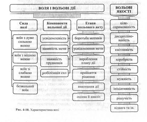 Після ухвалення рішення напруженість, як правило, спадає. За ухваленого рішення настає черга планування шляху досягнення мети, пошук способів і засобів. Основний етап у вольовому акті — виконання ухваленого рішення. Всю свою поведінку людина реалізує таким чином, щоб здійснити задуми. Однак вона не тільки діє, контролює, коригує свої дії. Практичне досягнення мети завжди поєднується з подоланням різних перешкод і труднощів, а це потребує вольового зусилля, особливо у сфері військової діяльності. Вольове зусилля є тим психічним явищем, яке визначає специфіку волі, чинить вольові дії на всіх етапах — боротьби мотивів, ухвалення рішення, планування, виконання. У боротьбі з труднощами вивчаються і вдосконалюються вольові якості особистості воїна. Отже, воля виявляється і розвивається у діяльності. При цьому вона виконує три взаємозв'язані функції — збуджувальну, гальмівну і контрольну. Основними особливостями волі є: — зумовленість мотивами та індивідуально-психічними особливостями особистості; — особистісний характер вольових дій. В історії психології відомі такі теорії волі: —інтелектуалістична (це усвідомленість, активність, що виражається через зв'язок" зі спонуканнями і пов'язана з подоланням зовнішніх і внутрішніх перешкод; це здатність регулювати свої дії); —емоційна (В. Вундт); —волюнтаристична (В. Джеймс). Кожна людина має свій індивідуальний набір вольових якостей, від яких залежать не тільки дії, а й вчинки особистості. Гама вольових якостей військовослужбовця містить цілеспрямованість, самовладання, витримку, наполегливість, рішучість, сміливість тощо. Цілеспрямованість — вияв волі, що характеризується чіткістю мети, завдань, неухильним прагненням до їх досягнення, незважаючи на труднощі військової служби. Витримка та самовладання виявляються в умінні стримувати свої почуття, якщо це потрібно, гальмувати імпульсивні дії, підпорядковувати себе поставленій меті. Наполегливість воїна дає йому'змогу продовжувати діяльність у найскладніших умовах, незважаючи на тимчасові невдачі й перешкоди. Це одна з найважливіших його якостей, що сприяють йому в досягненні мети. Але не слід плутати наполегливість з упертістю (ригідністю). Впертий воїн практично завжди намагається наполягати на своєму, не оцінюючи критично своїх суджень, бажань або рішень. Рішучість як вольова якість особистості дає змогу виконати ухвалене рішення без зайвих вагань. Воїни, позбавлені цієї якості, часто не можуть довести розпочату справу до кінця і невпевнені в правильності вибору засобу виконання рішення. Важливою умовою рішучості є сміливість, тобто готовність воїна йти на оптимальний і виправданий ризик. Безумовно, рішучість має грунтуватися на глибокій розсудливості й лише тоді вступати в дію, коли боєць остаточно вирішує, як йому діяти. Дисциплінованість — вияв волі, що характеризується усвідомленим, точним і своєчасним виконанням обов'язків. Вона виражається в умінні підпорядковувати свої дії потребам військової служби, завданням військового колективу. Усвідомлена дисциплінованість воїна припускає не сліпе підкорення за примусом, а добровільне, що грунтується на розумінні необхідності, усвідомленні свого військового обов'язку. Вона також включає ініціативу, творчість у розв'язанні задач, підвищене почуття відповідально