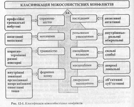 їх різновиди можна графічно зобразити так (рис. 12-1). Більш докладно схарактеризуємо ті різновиди, які мають вияв у військовому середовищі. В основному всі міжособистісні конфлікти поділяються на ділові та емоційні. Діловий конфлікт має місце у процесі виконання службових обов’язків, коли деякі військовослужбовці неякісно виконують свої посадові обов'язки, покладаючи їх виконання на інших, тощо. Емоційні конфлікти характеризуються тим, що вони виникають у сфері міжособистісних взаємин через слабке виховання окремих воїнів, їхню психічну несумісність. У зв'язку з тим, що причини таких конфліктів криються в особистісних якостях учасників цих конфліктів, їх складно контролювати та виявляти їхні причини. Такі конфлікти офіцери мають швидко локалізувати і застосовувати заходи для примирення супротивних сторін. У протилежному разі вони можуть призвести до тяжких наслідків. Міжособистісні конфлікти можна класифікувати за ознаками — за результатом «корисності». Тобто на основі принципу доцільності і недоцільності конфлікту можна виділити конструктивні (позитивні) та деструктивні (негативні) конфлікти. Дослідження Л'юїса Козера і Мортона Дойча засвідчили, що конструктивний (стабілізувальний) конфлікт виконує в оптимізації організаційної структури персоналу інтегративну функцію [109]. Відомо: у певних умовах, стимулюючи ефективний вихід із ситуації, що склалася, конфлікт об'єднує воїнів. У неконструктивних конфліктах один з опонентів зазвичай застосовує морально осуджені методи боротьби, прагне психічно пригнітити партнера, дискредитує його в очах колег. Стабілізувальний конфлікт спрямований на усунення недоліків у житті підрозділу, відхилень від загальнолюдських та усталених колективом норм І правил поведінки тощо. При з'ясуванні ролі конфлікту слід виходити з конкретної ситуації, тому що один і той самий конфлікт може бути деструктивним в одному плані та конструктивним в іншому, відігравати негативну роль на одному етапі розвитку й позитивну — на іншому. Основні вияви конструктивного конфлікту: — в особистісному конфлікті — сприяння позитивному розвитку особистості воїна у вигляді почуття невдоволеності, наприклад, результатами власної діяльності; — у міжособистісних конфліктах — запобігання стагнації життєдіяльності військового підрозділу; — сприяння його розвитку та формуванню позитивного морально-психологічного клімату; — утвердження нової мети, норм, ціннісних орієнтацій, прийомів, способів і форм колективної діяльності; — звільнення від руйнівних факторів життєдіяльності військового підрозділу; — згуртування перед зовнішньою небезпекою. Отже, конструктивний конфлікт у житті військового колективу виконує такі позитивні функції: пізнавальну, розвивальну, коригувальну, стабілізаційну і основну — інтегративну. Відповідно до цих різноманітностей конфліктів виділяють два види мотивації конфліктів: позитивну і негативну. Конфлікт позитивно мотивований тоді, коли він спрямований на затвердження істини та усунення недоліків життєдіяльності військового колективу, на об'єктивне розв'язання проблем, наявних як у офіційній, гак і в неофіційній сфері вояцьких взаємин, на оптимальне розв'язання проблем бойової та гуманітарної підготовки, які мають місце у життєдіяльності військового підрозділу. 