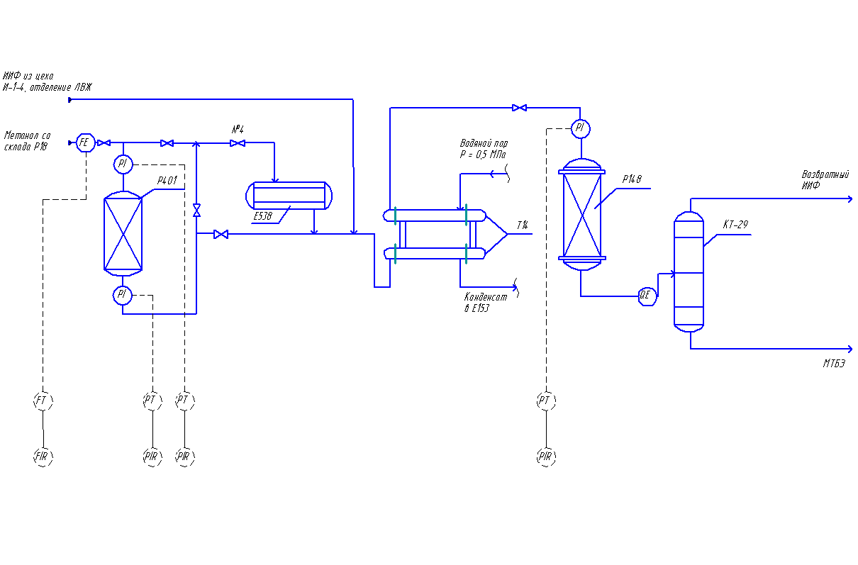 1.1 Назначение технологического процесса и роль его в предприятии Процесс предназначен для очистки метанола от ионов железа, а также для смешения его с изобутан – изобутиленовой фракцией, что повышает качество конечного продукта. Синтез МТБЭ осуществляется в присутствии высокоактивного макропористого сульфокатионита по обратимой реакции. С4H8 + CH3OH CH3OC(CH3)3 Реакция протекает в жидкой фазе с выделением тепла. Тепловой эффект реакции составляет 10 ккал/моль. 1.2 Основные виды оборудования: техническая характеристика, устройство, передаточная функция объекта. Форконтактор– это реактор синтеза метанола, представляет собой аппарат высокого давления, в который несколькими слоями загружен катализатор Емкость –емкость под давлением для хранения метанола. Теплообменный аппарат - устройство, в котором осуществляется теплообмен между двумя теплоносителями, имеющими различные температуры. По принципу действия теплообменники подразделяются на рекуператоры и регенераторы. Ректификационная колонна – цилиндрический вертикальный сосуд постоянного или переменного сечения, оснащенный внутренними тепло- и массообменными устройствами и вспомогательными узлами. Реактор синтеза МТБЭ –представляет собой кожухотрубный аппарат, трубное пространство которого заполнено катализатором. На заводе понятия не имеют что такое передаточная функция! 1.3 Технологический процесс изготовления изделий, его функциональная схема. Реакционная шихта подается в верхнюю часть реактора. Рабочее направление потока сверху вниз. Для предотвращения слёживаемости катализатора, предусмотрена возможность временного изменения направления потока шихты на противоположное, при возрастании перепада давления в реакторе 0, 2 МПа. Свежий метанол поступает на очистку от ионов железа в форконтактор 1. Форконтактор заполнен катализатором. Метанол подается в верхнюю часть аппарата. Пройдя через слой катализатора, очищенный от ионов железа метанол поступает в приемную емкость 2.Из ёмкости 2 метанол подается на смешение с изобутан – изобутеленовой фракцией. Давление в этой емкости выдерживается в пределах 0, 03 МПа. При завышении давления в емкости – открывается клапан на сбросе избыточного давления через конденсатор в атмосферу.В зимнее время, метанол перед очисткой от ионов железа, подогревается в теплообменнике 3 конденсатом, подаваемым насосом из ёмкости. После теплообменника 3 реакционная смесь поступает на реактор синтеза 4, где идет реакция синтеза с выделением тепла. Далее реакционная смесь поступает на ректификационную колонну 5, где идет процесс выделения МТБЭ и отгонки возвратной фракции.