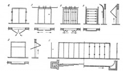 Рис.15.5 – Основные виды ворот промышленных зданий: а - распашные; б, в - раздвижные; г - подъемные; д - подъемно-поворотные; е - откатные