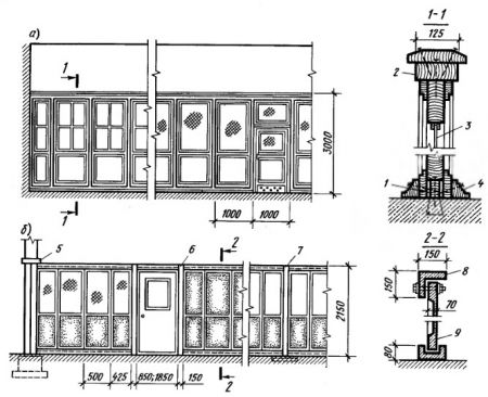 Рис. 1. Перегородки для промышленных зданий: а — деревянные, б — железобетонные, 1 — направляющая рейка, 2 — верхняя обвязка, 3 — стекло или сетка, 4 - плинтус, 5 - хомут, 6 - стойка-вкладыш, 7 - несущая стойка, 8 — обвязка, 9 - глухой щит. Панельные перегородки выполняют из легких бетонов, фибролита в деревянной обвязке с облицовкой, гипсобетона, а также каркасно-щитовой конструкции. Каркасно-обшивные панели могут быть размером 1, 2х6, 0х0, 08 и 1, 8х6, 0х0, 08 м. Каркасно-щитовые перегородки с деревянным каркасом и обшитые листами плоского асбестоцемента или гипсокартонными листами применяют для одноэтажных зданий с шумным производством. В качестве заполнителя может быть использован минераловатный войлок. Крепление осуществляют с помощью дюбелей. Деревянные выгораживающие перегородки собирают из столярных щитов шириной 446, 946 и 1946 мм и стоек-вкладышей сечением 54х50 мм (рис. 1, а). Щиты и стойки устанавливают на направляющий брус, прикрепляемый к полу, а по верху щитов укладывают брус жесткости, который крепят к стене или колоннам. При протяженности перегородок более 6 м устойчивость перегородок обеспечивают постановкой щитов-ребер шириной 446 мм. Стальные выгораживающие перегородки (рис. 2) состоят из стоек, устанавливаемых с шагом 1, 5 м, основных щитов размерами 1, 5х1, 8 и 1, 5х2, 4 м и добротных щитов размерами 1, 0х1, 8 и 1, 0х2, 4 м, навешиваемых на стойки. Стойки выполняют из труб или уголков. Щиты заполняют стальной сеткой, а нижнюю часть — оцинкованными профилированными листами. Листы между собой крепят заклепками. В герметизированных зданиях перегородки можно монтировать из листовых материалов с уплотнителем из специального резинового профиля.