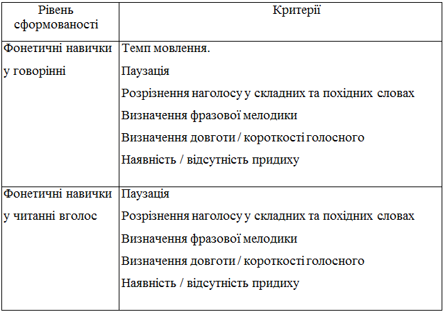 Критерії оцінювання рівня сформованості фонетичних навичок