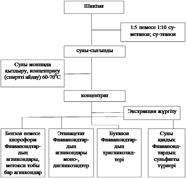 Флаваноидтар ө сімдіктердің барлық бө ліктерінде кездеседі, оларды бө лу тә сілі ө сімдіктің қ абығ ындағ ы, жапырағ ындағ ы, тү біріндегі, сабағ ындағ ы мө лшеріне жә не флаваноидтар тү ріне байланысты. Қ ұ рғ ақ шө п ө ң делетін болса, онда гидролиз тудыратын фермент ә серін тоқ тату ү шін, экстракция ә дісін ө згертеді. Экстракциялау ү шін еріткішті таң дап алу, флаваноидтардың полярлылығ ына тә уелді болады. Полярлығ ы кө п еріткіштер гликозидтерді жә не антроциандарды экстракиялау ү шін қ олданылады. Флавоноидтарды ө сімдік шикізатынан бө лудің қ олайлы ә дісі жоқ. Ә р кезде ө сімдік шикізатындағ ы химиялық қ ұ рамына байланысты зат табиғ атына жақ ын жә не тиімді ә дісті қ олданады. Ең кө п қ олданылатындары - таң дамалы экстракция, ауыр металл тұ здарын тұ ндыру жә не хроматографиялық ә дістер. Егер қ ышқ ылдар, кө мірсулар, полисахаридтер, гидролизденген тері илегіш заттар жә не гликозидтенген формалары болса оларды тө мен процентті спирт қ оспасынан бө леді, егер тері илегіш заттар мен флавоноидтардың агликондары табылса, оларды бө лу 90-96% (70%) спиртпен жү ргізіледі. Флавоноидтарды бө лу процесін гликозденген формасын тұ з немесе кү кірт қ ышқ ылында қ ыздырып гидролиздеумен біріктіруге болады. Таң дамалы экстракция ә дісінің маң ызы - ө сімдік шикізатынан флавоноидтарды ә р тү рлі еріткіштермен бө луде. Кө бінесе қ ұ рғ ақ материалмен жұ мыс жасағ анда полярлылығ ы ө сетін еріткіштер қ олданылады. Тө мен температурада қ айнайтын петролейн эфирі мен тө ртхлорлы кө міртектің кө мегімен бастапқ ыда талшық тү згіш жә не шайырлы заттардан тазартады. Ары қ арай флавоноидтарды бө лу ү шін ө сімдік материалдарын ережеге сай тө менгі спирттермен экстракциялайды. Спиртті ерітіндіні буландырып, қ алғ анына ыстық су қ ұ яды да суығ ан соң полярсыз қ осылыстарды (хлорофилл, майлар, эфир майлары) сулы фазадан хлороформмен немесе тө ртхлорлы кө міртекпен тазартады. Сулы фазадан флавоноидтарды этил эфирімен (агликон), этилацетатпен (кө бінесе монозидтер) жә не бутанолмен (биозидтер, триозидтер) бө леді [28]. Кө птеген флавоноидтарды бө лу мен тазалауда суда жә не этанолда ерімейтін ауыр металл иондарымен ә рекеттесетін тұ здар тү зуіне, сонымен қ атар тұ нба тү зетін pH ә серіне қ абілеттілігі қ олданылады. Қ ұ рамында В сақ инасында бос орто-гидроксил топтары бар қ осылыстарды орта немесе негізгі қ орғ асын ацетат тұ здарының спирттегі ерітіндісімен ө ң дегенде ашық сары жә не қ ызыл тү сті тұ нба тү зіледі. Тұ нбаны центрифугағ а салады жә не суспензияланғ аннан кейін кү кіртсутек кө мегімен спирт ерітіндісінде ыдыратады [29]. Ә р компонент фракциясын бө лгенде силикагельдегі, полиамидті немесе целлюлоза сорбенті бар колонкалы хроматография қ олданылады. Заттың экстракциясы хлороформның метил спирті қ оспасымен, егер сорбент полиамид болса сулы-спирт қ оспасы, ал целлюлоза болғ ан жағ дайда 5-30% сірке қ ышқ ылы қ олданылады. Флаваноидтардың тотық қ ан формасының гликозидтер қ ұ рылысын орнату ү шін қ олданылатын ә дістердің бірі гидролитикалық ыдырау болып табылады, ол қ ышқ ылдық, ферментативті, сілтілік гидролиз жә не сілтілік деструкция [30]. Сызбанұ сқ а-1 Шикізат қ ұ рамынан флаваноидты қ осылыстарды бө лу