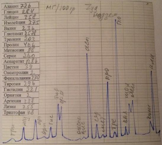 Амин қ ышқ ылдарын сараптау ү шін ГСХ ә дісі пайдаланылды. Бұ л сараптау «Карло Эрбо-4200» (Италия) аминқ ышқ ыл анализаторында белгілі ә дістеме бойынша ө тті. Стандартты ерітіндіні ұ стау уақ ытына байланысты сапалық жә не сандық сараптау жү ргізілді. Нә тижесінде 20 аминқ ышкылы анық талды (Зат: 24-34), 7- сурет пен 10- кестеде.