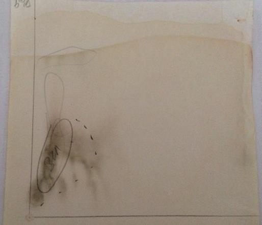 Екі жү йелі қ ағ азды хроматография ә дісі арқ ылы БСС (40: 12, 5: 29) жә не 6% НАс (сірке қ ышқ ылы) жү йесінде, ЖАК айқ ындағ ышын қ олдана отырып, сулы қ алдық тың қ ұ рамын анық тадық. Зерттеу нә тижесі бойынша сулы қ алдық тың қ ұ рамында флаваноидтың гликозидтелген формасы (Зат: 35) анық талды. Анық тау нә тижелері 11- кесте мен 8- суретте нақ ты кө рсетілген: