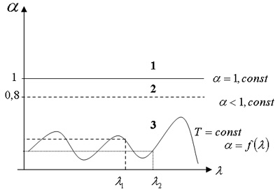 Тела, способные поглощать полностью при любой температуре все падающее на них излучение любой длины волны называются абсолютно черными: Есть также серые тела, для которых α < 1, но одинаковый для всех длин волн инфракрасного диапазона.