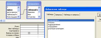 Добавьте таблицы «Сотрудники» и «Командировки» в область запроса из окна Добавление таблицы (кн. Добавить), закройте это окно.