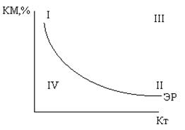 Показывает, какой результат дает предприятию каждые 100 ден.ед. оборота (обычно КМ выражают в процентах). По существу, это рентабельность оборота или рентабельность общей реализации. Например: для получения 5 млн. грн. НРЭИ на 50 млн. грн. оборота задействуется 100 млн. грн. активов. ЭР = 5 / 100 = 0, 05 =5% КМ = 5 / 50 = 0, 1 = 10% КТ = 50 / 100 = 0, 5 = 50% Таким образом, экономическая рентабельность составила 5%. На этот показатель повлияло то, что с каждой денежной единицы оборота предприятие получило 10 коп прибыли, но для получения 1 грн. оборота необходимо 2 грн. активов. Регулирование экономической рентабельности сводится к воздействию на две ее составляющие: КМ и КТ. Т.е. при низкой рентабельности продаж необходимо стремиться к ускорению оборота капитала и его элементов либо низкая деловая активность предприятия может быть компенсирована только понижением затрат на производство или ростом цен на продукцию. Факторы, которые влияют на: КМ: - ценовая политика; - объем и структура затрат; Кт: - отраслевые условия деятельности; - экономическая стратегия деятельности предприятия. Добиться высокой коммерческой маржи одновременно с высоким коэффициентом трансформации очень трудно, так как оборот присутствует в числителе одного сомножителя и в знаменателе другого. Поэтому при наращивании оборота удается увеличить экономическую рентабельность только тогда, когда активы растут медленнее оборота, а также НРЭИ увеличивается быстрее, чем оборот. В анализе факторов изменения рентабельности главное - решить вопрос, какой из показателей: КМ или Кт изменяется сильнее и быстрее, оказывая тем самым более мощное воздействие на общий уровень экономической рентабельности активов. На рис. отражена взаимосвязь КМ и Кт. Как видно из рисунка, идеальная позиция тяготеет к зоне III, но на практике соединить высокую КМ с высоким Кт бывает, как правило, очень трудно. Поэтому у большинства предприятий данные показатели располагаются между I и II зонами. При этом любое снижение к IV зоне опасно, так как грозит падением экономической рентабельности.