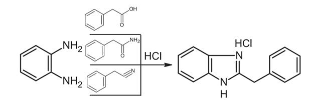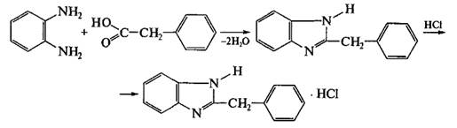 Первая промышленная партия дибазола была выпущена на этом заводе несколько раньше, в 1950 г. Впоследствии на этом производстве, вплоть до его остановки в 2004 г., вместо фенилуксусной кислоты использовали её нитрил. В настоящее время в промышленном синтезе дибазола в качестве предшественника бензильного фрагмента используют не только фенилуксусную кислоту или её нитрил, но также и её амид — фенилацетамид, при этом во всех случаях пятичленный цикл формируется комбинацией фрагментов по схеме 4 + 1 [25]: