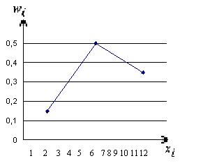 Для наглядности строят различные графики статистического распределения, в частности, полигон и гистограмму. Определение. Полигоном частот называют ломаную, отрезки которой соединяют точки (x1, n1), (x2, n2), …, (xk, nk). Для построения полигона частот на оси абсцисс откладывают варианты xi, а на оси ординат – соответствующие им частоты ni. Точки (xi, ni) соединяют отрезками прямых и получают полигон частот. Определение. Полигоном относительных частот называют ломаную, отрезки которой соединяют точки (x1, w1), (x2, w2), …, (xk, wk). Для построения полигона частот на оси абсцисс откладывают варианты xi, а на оси ординат wi. Точки (xi, wi) соединяют отрезками прямых и получают полигон относительных частот. На рисунке изображен полигон относительных частот следующего распределения: