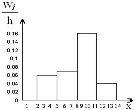 Рис. 7. Гистограмма частот. Для построения гистограммы частот на оси абсцисс откладывают частичные интервалы, а над ними проводят отрезки, параллельные оси абсцисс, на расстоянии Площадь i-го частичного прямоугольника равна На рисунке 2 изображена гистограмма частот распределения объема n=100, приведенного в таблице 1.