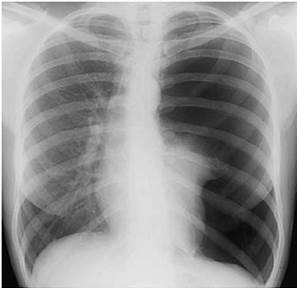 $$$002 Больная 28 лет, заболела остро 1, 5 недели назад: температура тела повысилась до 38, 6, появился сухой кашель, сильная боль в левой половине грудной клетки на вдохе. Назначена обзорная рентгенография органов грудной полости.