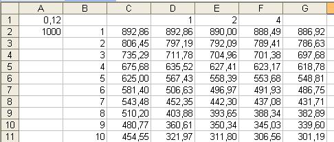 где NOM – номинальная стоимость; n – cрок до погашения; KS - купонная процентная ставка; j – банковская процентная ставка; TSO – текущая стоимость облигации. 2. Порядок выполнения расчета в EXCEL: 1. В ячейку A1 вводим первую величину купонной процентной ставки (в долях от 1) 2. В ячейку A2 вводим нарицательную стоимость облигации (1000), которую получим через 10 лет. 3. В ячейку B2 вводим цифру 4. В ячейку С1 вводим 5. Устанавливаем курсор в ячейку C2 и вводим формулу для определения текущей стоимости выплат по купонам 6. Ячейки C2 7. Выделяем ячейки C2 8. Устанавливаем курсор в ячейку C13 и вводим формулу для определения текущей стоимости номинала облигации, которую мы получим через n лет (в нашем примере n=10) 9. Выделяем ячейки C12 10. Расчётная величина в ячейке D14 должна быть равна номиналу облигации (в нашем примере