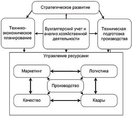Функциональные подсистемы (ФП ИС) – комплекс экономических задач с высокой степенью информационных обменов (связей) между задачами (некоторый процесс обработки информации с четко определенным множеством входной и выходной информации. Например, начисление сдельной заработной платы, учет прихода материалов, оформление заказа на закупку и т. д. ФП ИС информационно обслуживают определенные виды деятельности экономической системы (предприятия), характерные для его структурных подразделений и (или) функций управления. Интеграция ФП ИС в единую систему достигается за счет создания и функционирования обеспечивающих подсистем, таких как: информационная; техническая; программная; математическая; лингвистическая. Состав ФП во многом определяется особенностями экономической системы, ее отраслевой принадлежностью, формой собственности, размером, характером деятельности предприятия. ФП ИС могут строиться по различным принципам: предметному; функциональному; проблемному; смешанному (предметно-функциональному). Предметный принцип использования ИС в хозяйственных процессах промышленного предприятия определяет подсистемы управления производственными и финансовыми ресурсами: материально-техническим снабжением; производством готовой продукции; персоналом; сбытом готовой продукции; финансами. При этом в подсистемах рассматривается решение задач на всех уровнях управления с обеспечением интеграции информационных потоков по вертикали. Для реализации функций управления выделяют функциональные подсистемы, которые реализуются на различных уровнях управления и объединены в следующие контуры управления (маркетинг, производство, логистика, финансы): прогнозирование; нормирование; планирование (технико-экономическое и оперативное); учет; анализ; регулирование. Проблемный принцип формирования подсистем отражает необходимость гибкого и оперативного принятия управленческих решений по отдельным проблемам в рамках СППР, например, решение задач бизнес-планирования, управления проектами. Такие подсистемы могут реализовываться в виде ЛИС, импортирующих данные из КИС или в виде специальных подсистем в рамках КИС. На практике чаще всего применяется смешанный (предметно-функциональный) подход, согласно которому построение функциональной структуры ИС – это разделение ее на подсистемы по характеру хозяйственной деятельности, которое должно соответствовать структуре объекта и системе управления, а также выполняемым функциям управления (рис. 2).