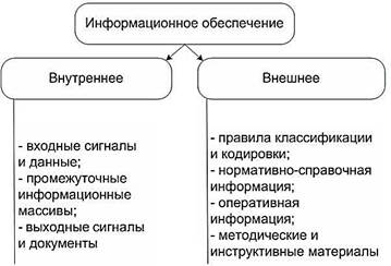 Информационное обеспечение – это совокупность средств и методов построения информационной базы (рис. 4). Оно определяет способы и формы отображения состояния объекта управления в виде данных внутри ИС, документов, графиков и сигналов вне ИС. Информационное обеспечение подразделяют на внешнее и внутреннее.