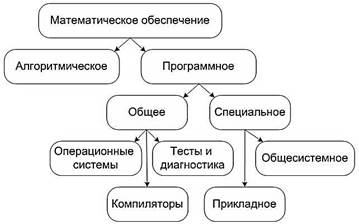 Математическое обеспечение состоит из алгоритмического и программного (рис. 5). Алгоритмическое обеспечение представляет собой совокупность математических методов, моделей и алгоритмов, используемых в системе для решения задач и обработки информации. Программное обеспечение состоит: - из общего ПО (ОС, трансляторы, тесты и диагностика и др., т. е. все то, что обеспечивает работу аппаратных устройств); - специального ПО (прикладное ПО, обеспечивающее автоматизацию процессов управления в заданной предметной области). Техническое обеспечение (рис. 6) состоит из устройств: измерения; преобразования; передачи; хранения; обработки; отображения; регистрации; ввода/вывода информации; исполнительных устройств.