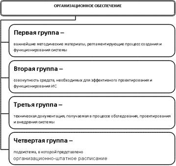 Кадровое обеспечение – это совокупность методов и средств по организации и проведению обучения персонала приемам работы с ИС. Его целью является поддержание работоспособности ИС и возможности дальнейшего ее развития. Кадровое обеспечение включает в себя методики обучения, программы курсов и практических занятий, технические средства обучения и правила работы с ними и т. д. Организационное обеспечение (рис. 7) – это совокупность средств и методов организации производства и управления ими в условиях внедрения ИС. Его целью является: выбор и постановка задач управления, анализ системы управления и путей ее совершенствования, разработка решений по организации взаимодействия ИС и персонала, внедрение задач управления. Организационное обеспечение включает в себя методики проведения работ, требования к оформлению документов, должностные инструкции и т. д. Это обеспечение является одной из важнейших подсистем ИС, от которой зависит успешная реализация целей и функций системы. В его состав входит четыре группы компонентов.