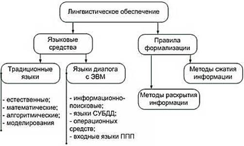 Правовое обеспечение предназначено для регламентации процесса создания и эксплуатации ИС, которая включает в себя совокупность юридических документов с констатацией регламентных отношений по формированию, хранению, обработке промежуточной и результирующей информации системы. Лингвистическое обеспечение (ЛО) представляет собой совокупность научно-технических терминов и других языковых средств, используемых в ИС, а также правил формализации естественного языка, включающих в себя методы сжатия и раскрытия текстовой информации для повышения эффективности автоматизированной обработки информации. Средства, входящие в подсистему ЛО (рис. 8), делятся на две группы: - традиционные языки (естественные, математические, алгоритмические, языки моделирования); - предназначенные для диалога с ЭВМ (информационно-поисковые, языки СУБД, операционных сред, входные языки пакетов прикладных программ).