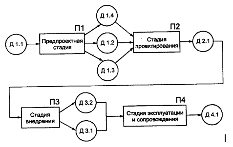 Рис. 3.1. ТСП стадий и этапов канонического проектирования ЭИС: Д1.1 – предметная область; Д1.2 – материалы обследования; Д1.3 – ТЭО, ТЗ на проектирование; Д1.4 – эскизный проект; Д2.1 – техно-рабочий проект (ТРП); Д3.1 – исправленный ТРП, переданный в эксплуатацию; Д3.2 – акт о приемке проекта в промышленную эксплуатацию; Д4.1 – модернизированный ТРП Традиционно этапы исследования предметной области – предприятия, обоснование проекта ЭИС для него и разработки технического задания объединяют термином «Предпроектная стадия» («Предпроектное обследование»), поскольку результаты выполнения работ на данных этапах не являются законченным проектным решением. Основное назначение «Предпроектной стадии» заключается в обосновании экономической целесообразности создания ЭИС и формулировании требований к ней. На первой «Предпроектной стадии» принято выделять 2 основных этапа: - сбор материалов обследования; - анализ материального обследования и разработка технико-экономического обоснования (ТЭО) и технического задания (ТЗ). В результате выполнения первого этапа проектировщики получают материалы обследования (Д1.2), которые должны содержать полную и достоверную информацию, описывающую изучаемую предметную область – предприятие, в том числе: цель функционирования; организационную структуру системы и объекта управления, т.е. его управленческие отделы, цехи, склады и хозяйственные службы; функции управления, выполняемые в этих подразделениях, протекающие в них технологические процессы обработки управленческой и экономической информации, а также материальные потоки и процессы их обработки, ресурсные ограничения. После выполнения второго этапа проектировщики получают количественные и качественные характеристики информационных потоков, описание их структуры и мест обработки, объемов выполняемых операций и трудоемкости их обработки. На основе этих материалов разрабатываются два документа: «Технико-экономическое обоснование проектных решений» (ТЭО), содержащее расчеты и обоснование необходимости разработки ЭИС для предприятия и выбираемых технологических и проектных решений (Д1.3), и «Техническое задание» (ТЗ), в состав которого входят требования к создаваемой системе и ее отдельным компонентам: программному, техническому и информационному обеспечению и целевая установка на проектирование новой системы (Д1.4). Эти документы являются основными для последующего проектирования ЭИС в соответствии с заданными требованиями. Для сложных ЭИС иногда на этой стадии включают третий этап – разработку «Эскизного проекта». На этапе «Эскизного проекта» сформулированные ранее требования служат основой для разработки предварительных решений по ЭИС в целом и отдельным видам обеспечения. Эти решения прорабатываются на логическом уровне, включая алгоритмы обработки информации, описание информационных потребностей пользователей на уровне названий документов и показателей. Втораястадия «Технорабочее проектирование» выполняется в 2 этапа: - техническое проектирование; - рабочее проектирование. На этапе «Техническое проектирование» выполняются работы по логической разработке и выбору наилучших вариантов проектных решений, в результате чего создается «Технический проект». Этап «Рабочее проектирование» связан с физической реализацией вы