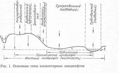 Ландшафт, по определению А. И. Перельмана (1975), – это сложная неравновесная система, в которой происходит взаимодействие и взаимопроникновение элементов между породой, почвой, водами, воздухом, живыми организмами. Впервые термин «ландшафт» был использован в первой половине XIX в. А. Гумбольдтом, Географами он был заимствован в XX в. Впоследствии понятие «Ландшафт» было положено в основу развития нового научного направления — ландшафтоведения. Ландшафт общее понятие. Как и любому научному направлению, геохимии ландшафта с целью исследования, классификации, картирования необходима простейшая таксономическая единица. Название такой единицы элементарный ландшафт, или элементарная географическая единица, – было предложено в 1926 г. Полыновым и Крашенинниковым. Другие исследователи в том же смысле использовали термины «микроландшафт», «экосистема», «биогеоценоз», «фация» и др., из которых наиболее употребительны в настоящее время «фация» и «биогеоценоз». Элементарный ландшафт приурочен к определенному элементу рельефа, однородной породе, почве к одному типу растительности. Например, вершина холма с дерново-подзолистой песчаной почвой, па которой произрастает лишайниковый бор, может быть выделена как элементарный ландшафт. Верхняя граница элементарного ландшафта проводится по пределу распространения микроорганизмов и пыли земного происхождения и тропосфере, нижняя — по первому от поверхности горизонту грунтовых вод. В пределах элементарною ландшафта под воздействием механических, химических и биологических факторов образуются формы микрорельефа, например муравейник в лесу, кочка на болоте, микрозападины, названные В. Б. Полыновым предельными структурными элементами ландшафта или деталями ландшафта. По условиям миграции химических элементов Б. Б. Полынов (1952) предложил различать три вида элементарных ландшафтов: элювиальный, супераквальный, субаквальный; М. А. Глазовская (1964) дополнила их новыми видами (рис. 1).