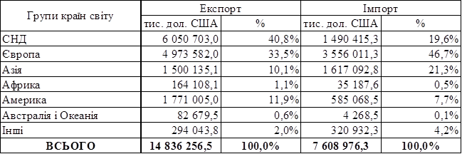 Таблиця 4.1 – Динаміка експорту-імпорту товарів за регіонами світу (2013 рік)