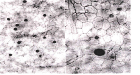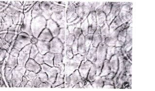 Рисунок 3 - Малины листья. Верхний эпидермис. Многоугольные полигональные клетки с прямыми стенками. Просвечивающие друзы, (слева ув. х 105; справа ув. х 200). С нижней стороны - клетки со слабоизвилистыми, извилистыми стенками. Клетки эпидермиса вдоль жилок вытянуты прямоугольной, веретеновидной и комбинированной формы. Видны простые волоски, устьица.