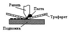 При контактном способе трафарет (бериллиевая бронза толщиной 0, 05 мм) плотно прилегает к подложке. При бесконтактном методе трафарет располагается на подложке с зазором 0, 4¸ 1 мм. Конструкционной основой трафарета является проволочная сетка, с диаметром проволоки 30¸ 40 мкм. Нанесение пасты выполняется с помощью установки, состоящей из держателя подложки, ракеля и привода для перемещения ракеля. На качество нанесения пасты влияют: § размер сетки трафарета (140 мкм – размер окна, 40 мкм – диаметр проволоки); § форма и материал ракеля; § расстояние трафарет-подложка (0, 2¸ 1, 5 мкм); § давление и скорость ракеля (50¸ 250 мм/сек); Оптимальный зазор между сеткой и подложкой зависит от размеров сетки и должно обеспечивать хорошее подпружинивание сетки, от которого зависит четкость контура элемента. С уменьшением размеров ячеек трафарета жесткость сетки увеличивается и оптимальный зазор уменьшается. Усилие на сетку со стороны ракеля составляет 10¸ 20 Н. Ракель изготавливается из упругого износостойкого и стойкого к органическим растворителям материала (полиуретан, фторкаучук). Угол при вершине ракеля составляет 90° или 60°, наклон рабочей поверхности ракеля - 45°±5°. Скорость рабочего хода ракеля определяется вязкостью пасты и требуемой толщиной наносимого слоя и лежит в диапазоне 50¸ 250 мм/сек. Если состав и вязкость пасты, а также применяемая сетка соответствует ТУ, то настройка процесса нанесения пасты сводится к отыскиванию оптимальных режимов (зазор, скорость, давление ракеля).