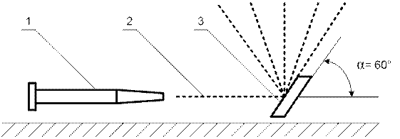 Рисунок 5 - Схема приспособления для получения потока распыленной жидкости: 1 – пожарный ствол; 2 – компактная струя жидкости; 3 – отбойная стенка.