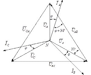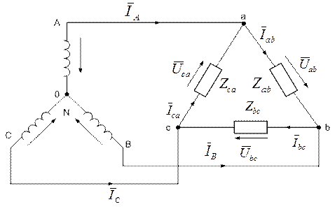 Рисунок 3.7.1 – Схема трехфазной цепи при соединении звездой генератора и треугольником приемников.
