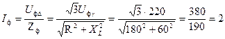 К соединенному звездой проводу генератору с фазным напряжением присоединяются треугольником три индуктивные катушки, каждая из которых имеет сопротивление