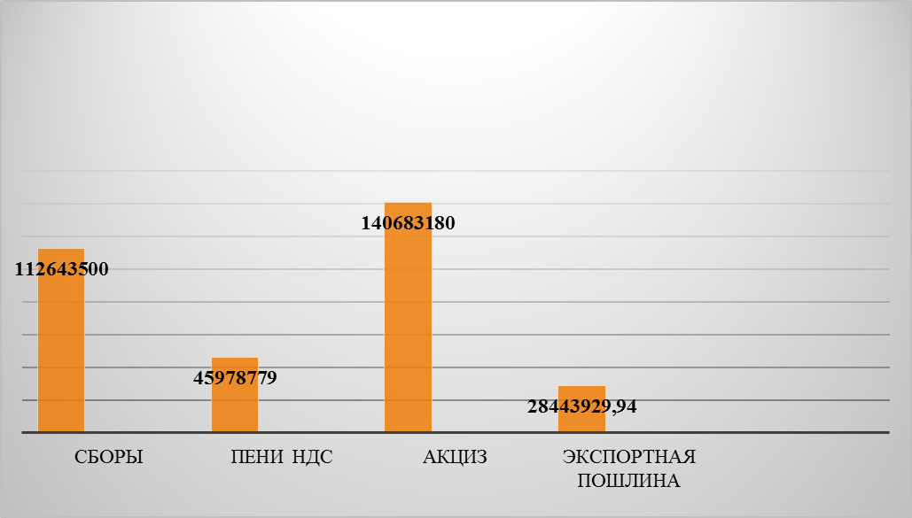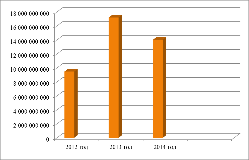 В 2014 году в федеральный бюджет Российской Федерации были перечислены сборы в размере 112 млн. 643 тыс. рублей, акциз на сумму 140 млн. 689 тыс. рублей, ввозная пошлина в размере 1 млн. 403 тыс. рублей, экспортная пошлина на сумму 28 млн. 443 тыс. рублей. А так же налог на добавленную стоимость на сумму 11 млрд. 197 млн. 540 тыс. рублей и пени на налог на добавленную стоимость в размере 459 тыс. рублей. Всего в федеральный бюджет Российской Федерации за 2014 год было перечислено 14 млрд. 022 млн. 001 тыс. рублей. Исходя из этого рисунка можно проанализировать сколько за последние 3 года было перечислено в федеральный бюджет Российской Федерации. На данном графике показано, что в 2013 году в федеральный бюджет Российской Федерации было перечислено 17 млрд. 193 млн. 699 тыс. рублей. И это наивысший показатель за 2012-2014 гг. Наименьший показатель был в 2012 году и он составлял 9 млрд. 475 млн. 629 тыс. рублей.