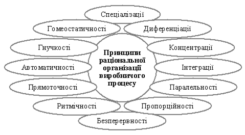 Під організацією виробничих процесів розуміють різні методи сполучення всіх елементів системи в просторі і часі з метою досягнення ефективного їх використання. Раціональна організація виробничого процесу має відповідати низці вимог і будуватися на таких принципах, як: спеціалізація, диференціація, концентрація, інтеграція, паралельність, пропорційність, безперервність, ритмічність, прямоточність, автоматичність, гнучкість, гомеостатичність (рис. 1).