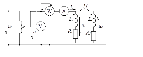 а так как ток i1 возрастает, то di1/dt > 0. Поэтому при отклонении стрелки вольтметра в сторону шкалы (U2 > 0) М -положительно, при отклонении стрелки в противоположную сторону (U2 < 0) M -отрицательно (естественно, для заданной маркировки зажимов катушек). Величину же М определяют на основании другого опыта (рис. 3) при подключении к одной из катушек источника синусоидального напряжения и применении приборов электромагнитной или электродинамической системы. При этом