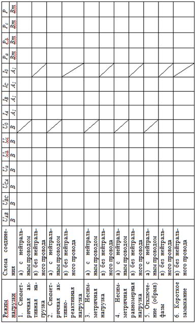 4. Проведение эксперимента, обработка данных A.Содержание и порядок проведения работы 1. Подключить фазоуказатель к зажимам источника питания и определить порядок чередования его фаз. 2. Измерить линейные напряжения источника и записать их величины в протокол эксперимента. 3. Собрать нагрузку по схеме треугольник, отключив из ее 4. Не изменяя активных сопротивлении фаз, включить с помощью тумблеров КС конденсаторы во все фазы нагрузки. Произвести аналогичные п. 3 измерения и результаты занести в таблицу. 5. По указанию преподавателя разорвать одну из фаз в схеме п. 4. Произвести аналогичные пп. 3-4 измерения. Измерить активную мощность нагрузки по схеме двух ваттметров. Результаты измерений записать в таблицу. 6. Восстановить схему п.4. По указанию преподавателя ра- 7. По указанию преподавателя собрать схему несимметричной нагрузки. Измерить фазные и линейные токи, фазные напряжения и мощности. Измерить активную мощность нагрузки по схеме двух ваттметров. Результаты измерений записать в таблицу.