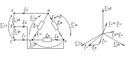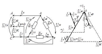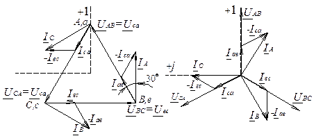 Для несимметричного треугольника (рис.1.) фазные токи рассчитывают по формулам: