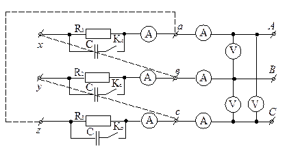 4) Обрыв линейного провода. Нагрузка резистивно-емкостная. Допустим, что оборван линейный провод В (рис. 5, а) в цепи, симметричной до обрыва. В этом случае система нагрузки из трехфазной превращается в однофазную. Hагрузка оказывается подключенной только к линейному напряжению 3. Описание экспериментальной установки В лабораторной работе используется та же установка, что