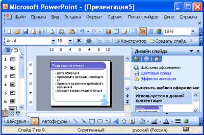 Что касается шаблона оформления, то в нем содержатся только средства форматирования слайдов презентации, т.е. с его помощью можно назначить только стиль слайда, а разметку слайдов надо осуществлять с помощью панели «Разметка слайдов» в области задач. Другими словами шаблоны оформления – это шаблоны, которые представляют собой набор параметров шрифтов, используемых в слайдах, цвет фона, цветовые схемы слайдов презентации т.д.