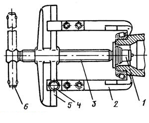 1 — наконечник винта; 2 — захват; 3 — винт съемника; 4 — гайка крепления захватов на траверсе; 5 — траверса съемника; 6 — рукоятка винта съемника