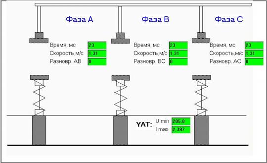 Рис. 5 Ментальная модель выключателя в режиме «Отключено» Система АСУКВВ должна обеспечивать в процессе выполнения циклов «включения – отключения» автоматический контроль следующих параметров, характеризующих функциональное состояние, настройку и регулировку механизма выключателя · ход подвижных контактов ВДК; · полный ход изоляционных тяг выключателя; · собственное время включения; · собственное время отключения; · полное время отключения; · напряжение питания электромагнитов управления YAC и YAT; · токи потребления обмоток электромагнитов управления YAC и YAT с выделением их максимальных значений; · средние скорости движения подвижного контакта ВДК при включении и отключении на заданных временных интервалах; · выбег хода вала выключателя при отключении; · суммарное время дребезга контактов при включении; Перечисленные параметры показаны на ментальных моделях 3.3. Система автоматически отрабатывает следующие типы операций: · «В» включение; · «О» отключение; · «В» -t -«О» ( включение-пауза-отключение)