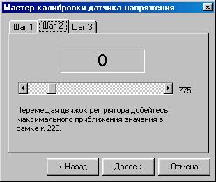 В диалоговом окне «Настройка и калибровка» с закладкой «Ток и напряжение» предусматриваем поле для ввода калибровочных коэффициентов для напряжения с окном и «крутилкой» для ввода значений, токов включения и токов отключения с аналогичным окном. После надписей «Напряжение», «Ток включения» и «Ток отключения целесообразно указать диапазон изменения соответствующих параметров. Ниже поля ввода калибровочных коэффициентов расположим кнопку «Мастер калибровки датчика напряжения» и самом низу окна кнопки управления «ОК» и «Отмена» Для проведения калибровки датчика напряжения на обмотках электромагнитов управления выключателя необходимо убедиться, что выключатель отключен, напряжение на систему подано. Значение напряжения должно быть замерено заранее измерительным прибором. Далее проводятся следующие действия: При нажатии на кнопку Мастер калибровки U должно открыться диалоговое окно «Мастер калибровки датчика напряжения» с закладками «Шаг 1», «Шаг 2» и «Шаг 3» Разместим в центре окна окно с цифровым отображением напряжения и полосой прокрутки, расположенное под окном Внизу диалогового окна располагаем командные кнопки «Назад», «Далее», «Отмена»