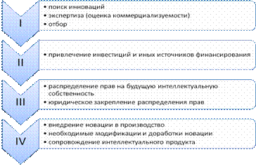Прежде всего, в процессе коммерциализации происходит поиск и отбор проектов для внедрения в производство ещё до окончания НИР. Поиск инновационных проектов осуществляется согласно критериям, предъявляемым к ним субъектом коммерциализации. На втором этапе процесса коммерциализации необходимо привлечь инвестиции для финансирования внедрения новации. Важным моментом является наличие налаженных контактов с потенциальными потребителями инновационных продуктов и услуг. Третий этап процесса коммерциализации – распределение и закрепление прав на возникающую интеллектуальную собственность. Этот момент является особо важным, поскольку инновация, не защищённая должным юридическим образом, фактически не принадлежит своему разработчику и может быть свободно скопирована и продана другими исследователями. Наконец, последним этапом коммерциализации является внедрение новации в производство с дальнейшей её доработкой и технико-правовым сопровождением. На данном этапе осуществляется конечная цель процесса коммерциализации: новация реализуется в конкретном рыночном продукте, принося прибыль по обратной цепи от производителя к правообладателю и разработчику – п/п и коллективу отдела НИОКР. Группы рисков возникающие в процессе коммерциализации · Риски ошибочного выбора инновационного проекта · Риски, связанные с финансированием инновационной деятельности · Риски, связанная со снабжением инновационной деятельности ресурсами, необходимыми для её осуществления · Маркетинговые риски · Риски неисполнения хозяйственных договоров · Риски возникновения непредвиденных затрат и снижения доходов · Риски усиления конкуренции в сфере инноваций · Риски связанные с недостаточным уровнем кадрового обеспечения инновационной деятельности · Риски связанные с обеспечением прав собственности на продукт инновационной деятельности