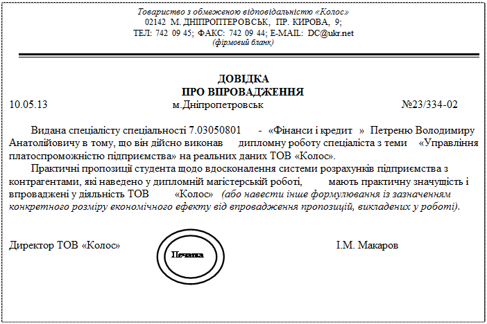 б) практична цінність результатів дипломної роботи, тобто де вони можуть бути застосовані (1 речення);