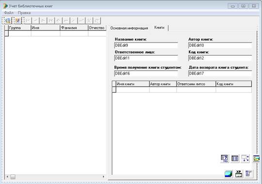 Код программы: type TForm1 = class(TForm) DBGrid1: TDBGrid; MainMenu1: TMainMenu; N1: TMenuItem; N6: TMenuItem; N7: TMenuItem; N8: TMenuItem; XPManifest1: TXPManifest; PageControl1: TPageControl; TabSheet1: TTabSheet; Label1: TLabel; Label2: TLabel; DBEdit1: TDBEdit; Label3: TLabel; DBEdit3: TDBEdit; ToolBar1: TToolBar; ToolButton4: TToolButton; ToolButton5: TToolButton; ToolButton6: TToolButton; ImageList1: TImageList; Label4: TLabel; DBEdit4: TDBEdit; Label5: TLabel; DBEdit6: TDBEdit; Label6: TLabel; Label7: TLabel; DBEdit8: TDBEdit; DBEdit13: TDBEdit; Label13: TLabel; GroupBox1: TGroupBox; DBEdit7: TDBEdit; Label16: TLabel; DBEdit14: TDBEdit; TabSheet3: TTabSheet; Label9: TLabel; Label10: TLabel; DBEdit10: TDBEdit; DBEdit9: TDBEdit; Label11: TLabel; DBEdit11: TDBEdit; DBEdit12: TDBEdit; Label14: TLabel; DBGrid2: TDBGrid; Label12: TLabel; Label15: TLabel; OpenPictureDialog1: TOpenPictureDialog; DBEdit5: TDBEdit; DBMemo1: TDBMemo; ToolButton8: TToolButton; ToolButton9: TToolButton; DBNavigator1: TDBNavigator; DataSource1: TDataSource; DBEdit2: TDBEdit; Label8: TLabel; Query2: TQuery; Table2: TTable; Label19: TLabel; DBEdit16: TDBEdit; DBEdit17: TDBEdit; procedure N8Click(Sender: TObject); procedure About1Click(Sender: TObject); procedure N6Click(Sender: TObject); procedure N10Click(Sender: TObject); procedure N11Click(Sender: TObject); procedure FormActivate(Sender: TObject); procedure ToolButton8Click(Sender: TObject); private { Private declarations } public { Public declarations } end; var Form1: TForm1; save, fileSave: boolean; fileName: String; stDay: array[1..7] of string[11] = ('воскресенье', 'понедельник', 'вторник', 'среда', 'четверг', 'пятница', 'суббота'); stMonth: array[1..12] of string[8] = ('января', 'февраля', 'марта', 'апреля', 'мая', 'июня', 'июля', 'августа', 'сентября', 'октября', 'ноября', 'декабря'); implementation {$R *.dfm} procedure TForm1.N8Click(Sender: TObject); begin Form2.ShowModal; end; procedure TForm1.About1Click(Sender: TObject); begin Form3.ShowModal; end; procedure TForm1.N6Click(Sender: TObject); begin Close(); end; procedure TForm1.N10Click(Sender: TObject); begin Label5.Caption: ='Yo`nalish: '; Label7.Caption: ='Kurs: '; Label8.Caption: ='Nomer: '; Label1.Caption: ='Ismi: '; Label2.Caption: ='Familya: '; Label3.Caption: ='Otchestva: '; Label4.Caption: ='Tugilgan yili: '; Label13.Caption: ='Adres: '; Label16.Caption: ='Telefon: '; Label9.Caption: ='Kitob nomi: '; Label10.Caption: ='Kitob mualifi: '; Label12.Caption: ='Kitob kodi: '; Label11.Caption: ='Masul xodim: '; Label14.Caption: ='Talabaning kitob olgan vaqti: '; Label15.caption: ='Talabaning to`pshirgan vaqti: '; TabSheet1.Caption: ='Asosiy malumotlar'; TabSheet3.Caption: ='Kitoblar'; GroupBox1.Caption: ='Qo`shimcha malumot'; N1.Caption: ='Fayl'; n6.Caption: ='Chiqish'; n8.Caption: ='Qidirish'; Form2.RadioButton6.Caption: ='Yo`nalish'; Form2.RadioButton4.Caption: ='kurs'; Form2.RadioButton8.Caption: ='Guruh'; Form2.RadioButton1.Caption: ='Ism'; Form2.RadioButton2.Caption: ='Familya'; Form2.RadioButton5.Caption: ='Adres'; Form2.RadioButton7.Caption: ='Kitob'; n7.Caption: ='Tuzatish'; end; procedure TForm1.N11Click(Sender: TObject); begin Label5.Caption: ='Направления: '; Label7.Caption: ='Курс: '; Label8.Caption: ='Номер: '; Label1.Caption: ='Имя: '; Label2.Caption: ='Фамилия: '; Label3.Caption: ='Отчество: '; Label4.Caption: ='Дата рождения: '; Label13.Caption: ='Адрес: '; Label13.Caption: ='Телефон: '; Label9.Caption: ='Имя книги: '; Label10.Caption: ='Автор книги: '; Label12.Caption: ='Код книги: '; Label11.Caption: ='Ответсини литсо: '; Label14.Caption: ='Время получение книги студента: '; Label15.caption: ='Дата возврата книга студента: '; GroupBox1.Caption: ='Дополнительная информация'; N1.Caption: ='Файл'; n6.Caption: ='Выход'; n8.Caption: ='Поиск'; TabSheet1.Caption: ='Оснавная информация'; TabSheet3.Caption: =' Книги '; N7.Caption: ='Правка'; Form2.RadioButton6.Caption: ='Направления '; Form2.RadioButton4.Caption: ='Курс '; Form2.RadioButton8.Caption: ='Группы'; Form2.RadioButton1.Caption: ='Имя'; Form2.RadioButton2.Caption: ='Фамилия'; Form2.RadioButton5.Caption: ='Адрес'; Form2.RadioButton7.Caption: ='Книга'; end; procedure TForm1.FormActivate(Sender: TObject); var Present: TDateTime; Year, Month, Day: Word; begin with Session do begin ConfigMode: = cmSession; try AddStandardAlias('kollej', ExtractFilePath(ParamStr(0))+'DATA\', 'PARADOX'); Table2.Active: =True; finally ConfigMode: = cmAll; end; end; end; procedure TForm1.ToolButton8Click(Sender: TObject); begin DataSource1.DataSet: =Table2; end; end. Вывод: я приобрёл практические навыки разработки оконного программного интерфейса, закрепить навыки отладки и документирования программного обеспечения.